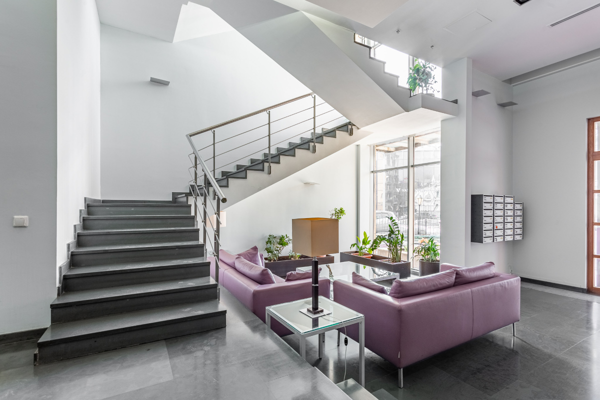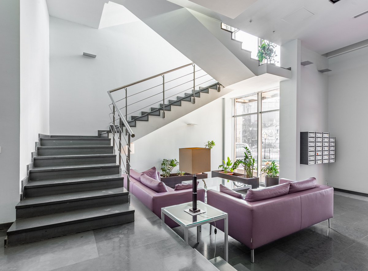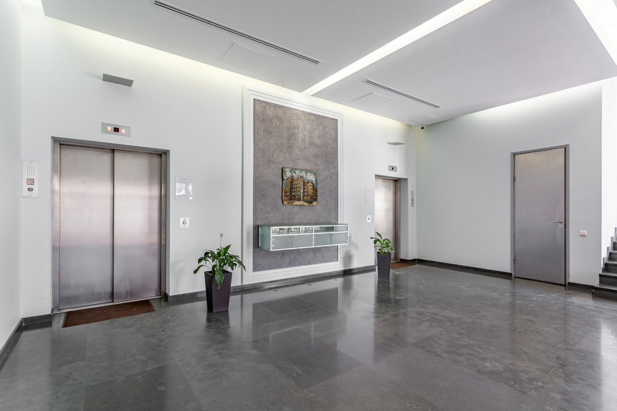 Первый этаж занимает большой лобби с отделкой из мрамора. Дежурит охрана, организованы зоны ожидания. В доме предусмотрены подземный паркинг и наземная парковка. Внутренняя территория огорожена, установлены шлагбаум и видеонаблюдение. Для юных жителей во дворе оборудована игровая площадка.